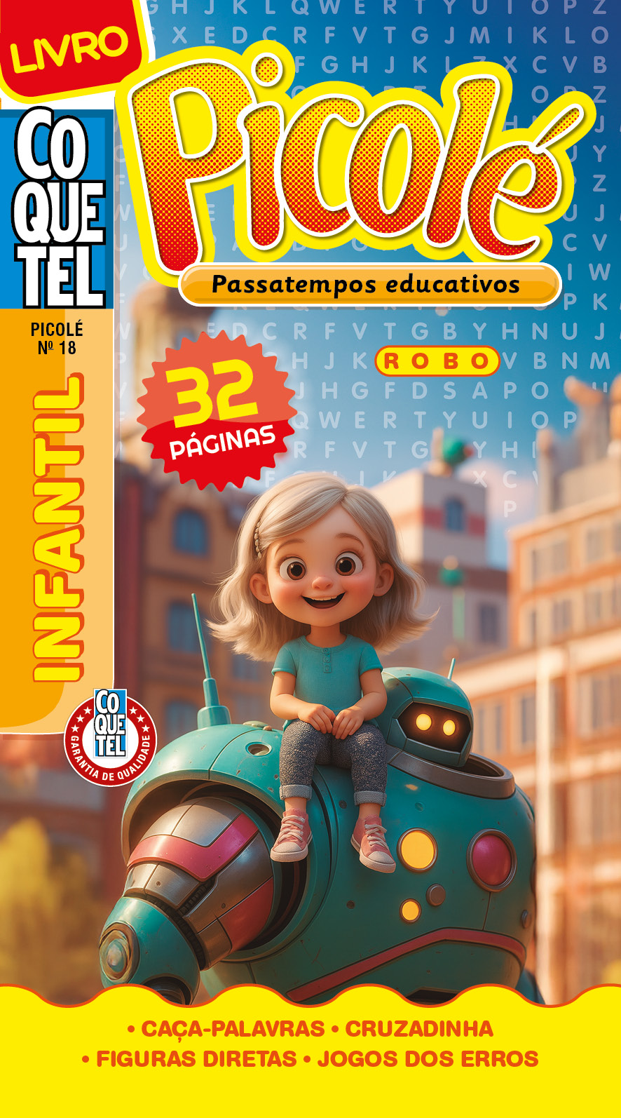 O livro Picolé — Passatempos educativos traz 32 páginas completamente coloridas e repletas de caça-palavras, cruzadinhas, figuras diretas e jogos dos erros, pensados para crianças de 6 a 9 anos: